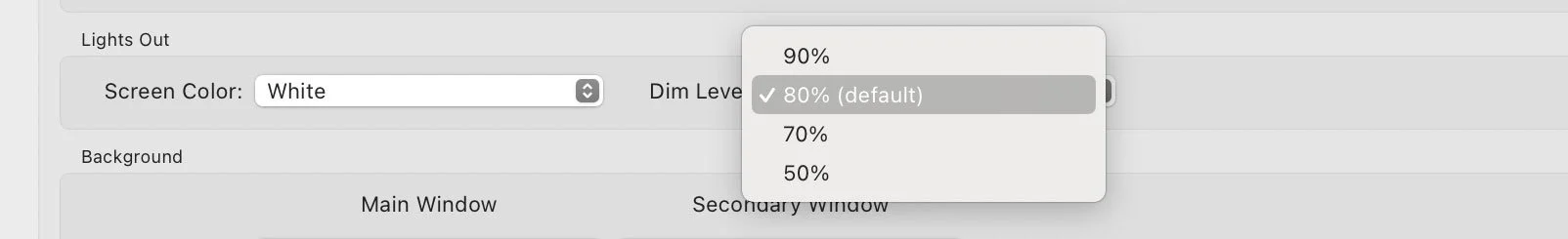 There are another few features of the Lights Out function that you can control. Though the menus: Preference > Interface > Lights Out